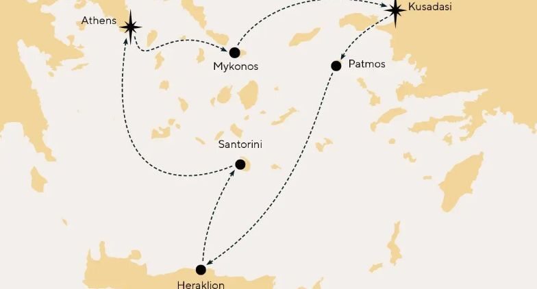 Μύκονος, Κουσάντασι (Έφεσος), Πάτμος, Ηράκλειο, Σαντορίνη, Λαύριο